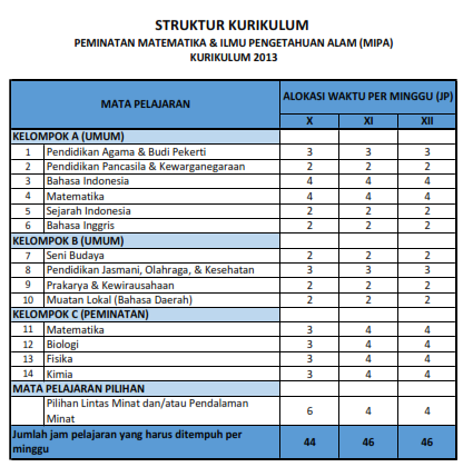 Berdasarkan Peraturan Menteri Pendidikan dan Kebudayaan Republik Indonesia No.36 Tahun 2018, Peminatan Matematika dan Ilmu Pengetahuan Alam (MIPA) pada Kurikulum 2013 merupakan jurusan dengan mata pelajaran peminatan Matematika, Biologi, Fisika, dan Kimia. Adapun struktur kurikulum yang harus ditempuh pada peminatan ini adalah sebagai berikut :