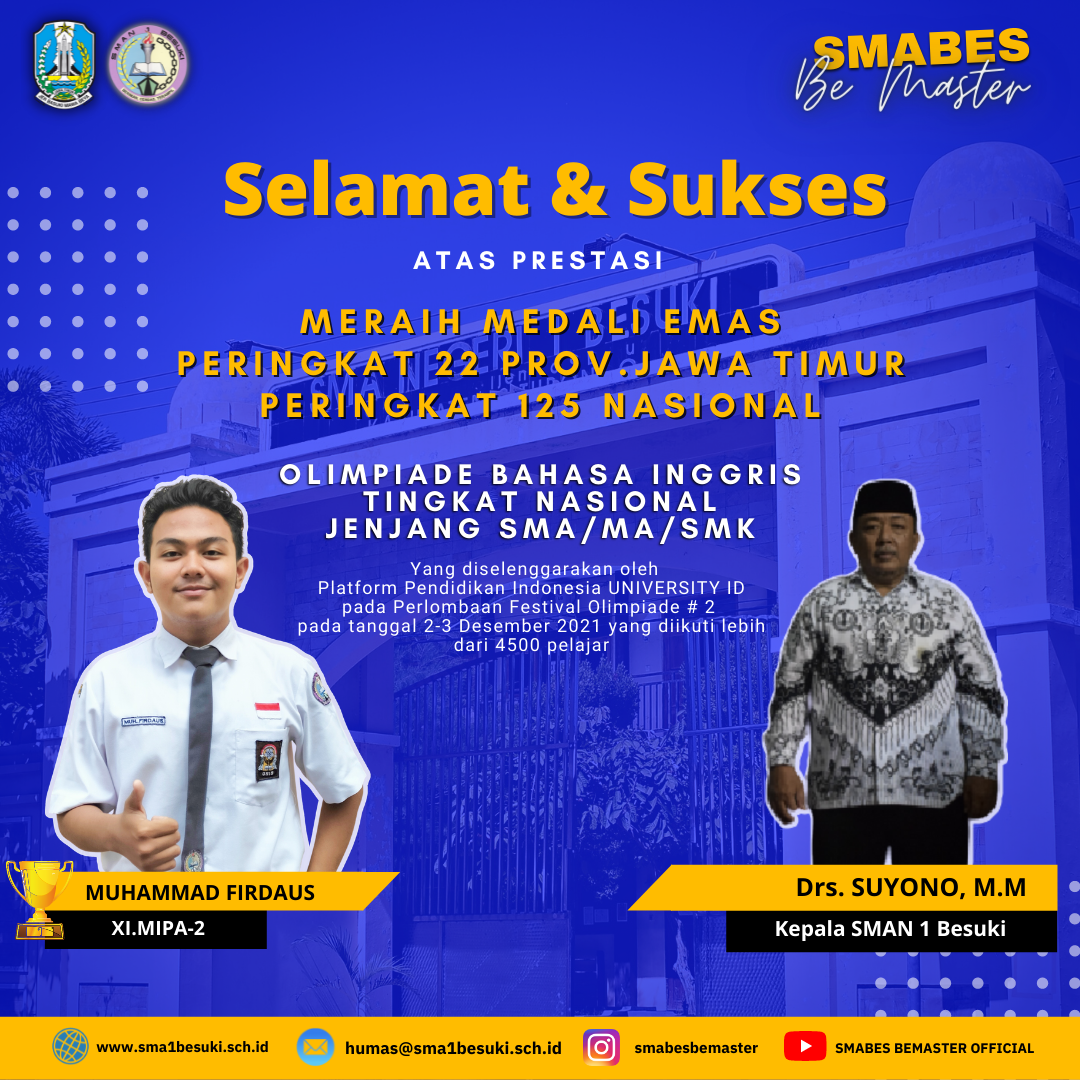 Peringkat 125 Nasional dan Peringkat 22 Provinsi Jawa Timur dalam Olimpiade Bahasa Inggris Jenjang SMA/MA/SMK yang diselenggarakan oleh Platform Pendidikan Indonesia University.Id pada Festival Olimpiade #2 yang diselenggrakan pada tanggal 2-3 Desember 2021